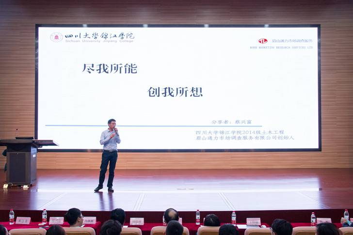 我校2018届土木工程学院毕业生,现任眉山通力市场调查服务有限公司负责人蔡兴富讲述了自己的创业经历,分享了创业心得。他说,创业过程中,他一直坚定“想改变趁现在”这一信念,他希望学弟学妹们不断更新思想、抓住形势、与时俱进。