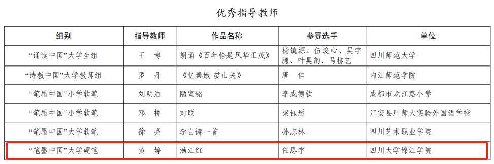 近日,由教育部、国家语委主办的全国第三届中华经典诵写讲大赛落下帷幕。我校学生任思宇作品《满江红》获“笔墨中国”汉字书写大赛“大学硬笔组”一等奖,指导老师黄婷获“优秀指导教师”称号。