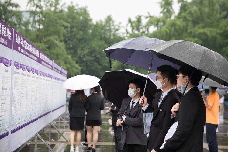 座谈会开展的同时,夏季招聘会在学校杏坛广场热烈举行,70家企业进校为毕业生提供1400多个岗位。招聘会现场,人潮涌动,气氛热烈。晏世经校长、林红书记等校领导和相关部门负责人冒着大雨到场与各单位招聘负责人、应聘学生进行亲切交谈,详细了解招聘单位的用人需求和毕业生的求职意愿。同学们身穿正装,带着精心准备的简历和自荐信来到展位前,就工作内容、发展前景、薪资待遇等问题向招聘单位咨询。同学们准备充分、精神饱满,表现出积极主动的就业心态,部分同学当场与用人单位达成初步就业意向。