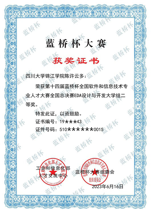 本届大赛共吸引来自北京大学、清华大学、西安交通大学等1600多所高校的超17.3万名选手报名参赛。经过激烈角逐,我校电气与电子信息工程学院学生陈许云多和陈柏松分获EDA设计与开发大学组全国总决赛二等奖和三等奖。