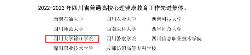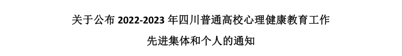 近日,四川省心理学会高校心理健康教育专委会发布了《关于公布2022-2023 年四川普通高校心理健康教育工作先进集体和个人的通知》,我校获2022-2023 年四川省普通高校心理健康教育工作先进集体荣誉称号。