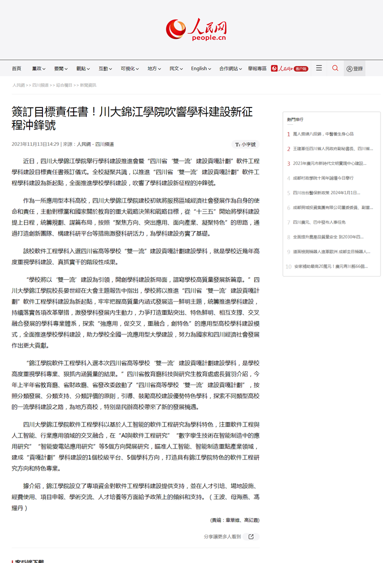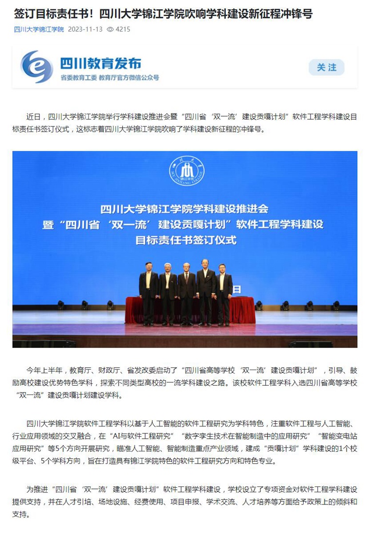 我校举行学科建设推进会暨“四川省‘双一流’建设贡嘎计划”软件工程学科建设目标责任书签订仪式,学校紧扣热点,深入挖掘,推出深度报道《签订目标责任书!我校吹响学科建设新征程冲锋号》。该报道获人民日报、凤凰网、封面BV伟德安装下载、中国教育发布(教育部官方APP)、四川省教育厅官网、四川教育发布、教育导报、中国教育在线、今日头条、学习强国等主流媒体广泛关注。截至目前阅读总量95万。