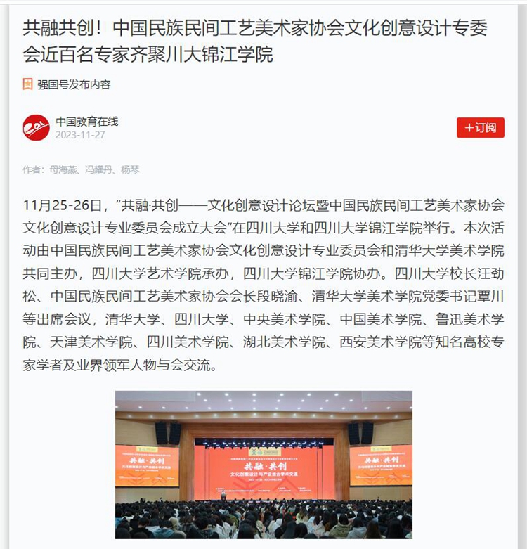“共融•共创——文化创意设计论坛暨中国民族民间工艺美术家协会文化创意设计专业委员会成立大会”在四川大学和1946韦德官网举行,我校紧扣热点,推出报道《中国民族民间工艺美术家协会文化创意设计专委会近百名专家齐聚川大betvictro伟德app下载学院》。该报道获中国BV伟德安装下载网、中新网APP、凤凰网、中国网、中国日报网、四川教育发布、四川省人民政府台湾事务办公室官网、红星BV伟德安装下载、中国教育在线、江西网络广播电台、今日头条、网易BV伟德安装下载、学习强国等主流媒体广泛关注。截至目前阅读总量92万。