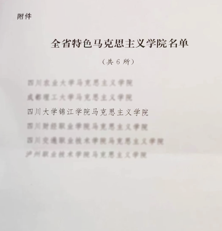 近日,中共四川省委宣传部、省教育厅下发《关于印发全省特色马克思主义学院名单的通知》,我校入选首批四川省特色马克思主义学院,是入选的6所高校中唯一一所民办高校。