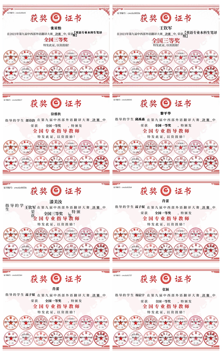近日,2023年第九届中西部外语翻译大赛全国决赛落下帷幕。由外国语学院黎平华、漆美汝、徐雅秋、肖蕾、张颖5位英语老师指导,来自外国语学院、数字经济学院、计算机学院、商学院的邱禹森、郎诗韵、鬲子驭、杨宸宇、毛译迦、王钦军、张星怡7名同学在本次大赛中获全国一等奖4项、二等奖1项、三等奖2项,5位老师获全国专业指导老师奖。
