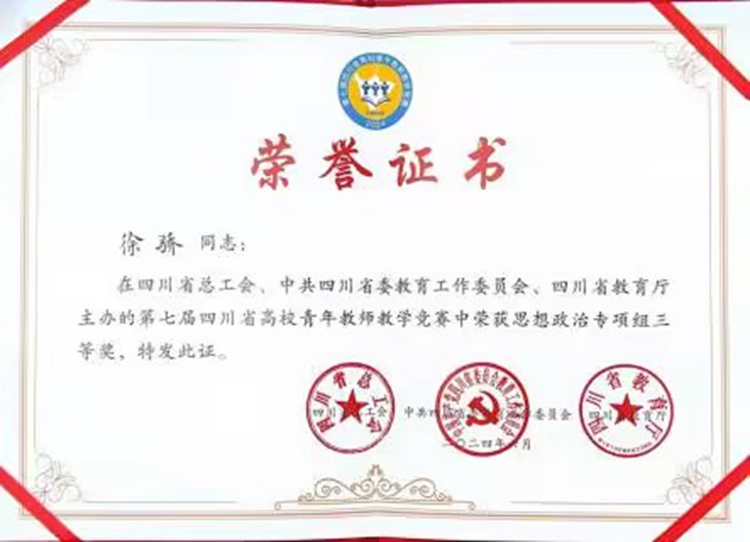 6月26日至28日,第七届四川省高校青年教师教学竞赛(决赛)在西华师范大学举行。我校马克思主义学院教师徐骄获思想政治专项组三等奖,学校获优秀组织奖。