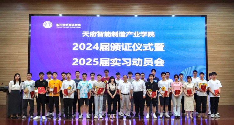 日前,天府智能制造产业学院2024届(首届)毕业生颁证仪式暨2025届毕业生实习动员会在学术会堂举行。2024届机械设计制造及其自动化专业毕业生冯翔宇作为优秀毕业生代表上台接受了校企双方颁发的智能制造行业能力认证证书。谈及能免试用期入职通威太阳能,冯翔宇同学难掩欣喜,对学院的培养和老师的付出表达真诚的感谢:“学院的智能制造课程给我打好了理论基础,企业实习的5个月不仅锻炼了动手能力,更让我对智能制造一线岗位素质要求有了新的认知。”