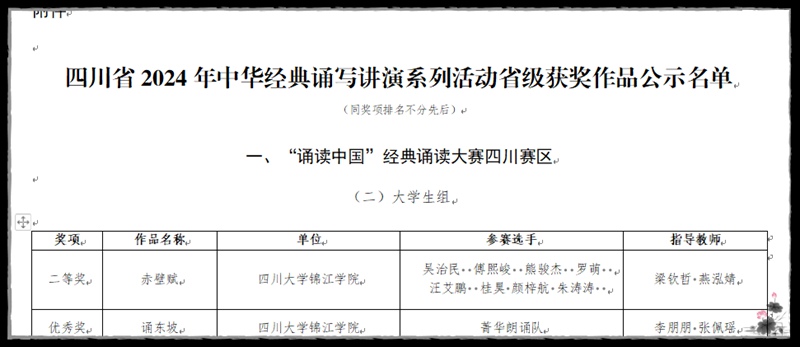 我校学子获四川省2024年中华经典诵写讲演系列活动二等奖